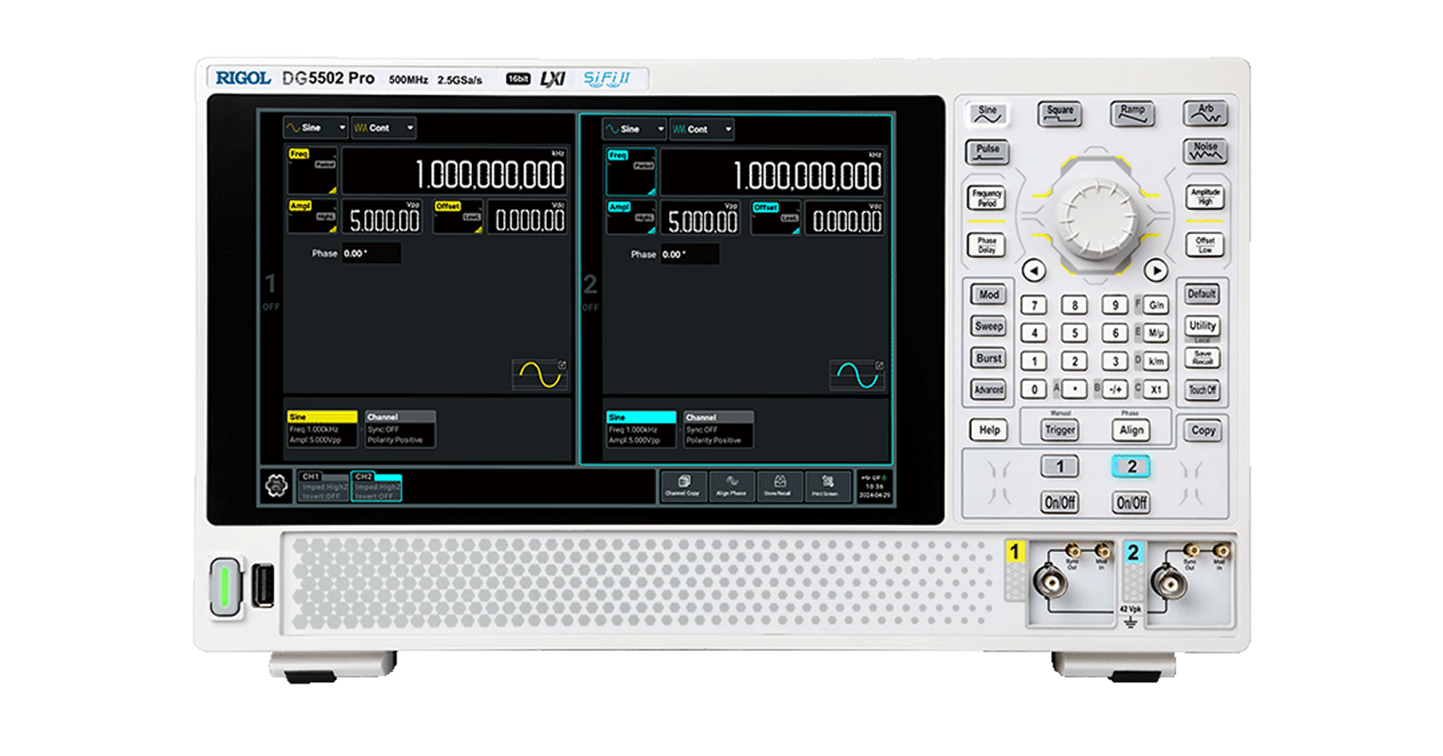 Генераторы сигналов произвольной формы серии DG5000 Pro — это представители нового поколения генераторов сигналов RIGOL с изолированными каналами. Изделие собрано на технологической платформе Si-Fi II, обеспечивает максимальную частоту дискретизации 2,5 Гвыб/с, выходную частоту синусоидального сигнала 500 МГц, вертикальное разрешение 16 бит, имеет ряд новых функциональных возможностей для удовлетворения потребностей в различных отраслях и сценариях применения.